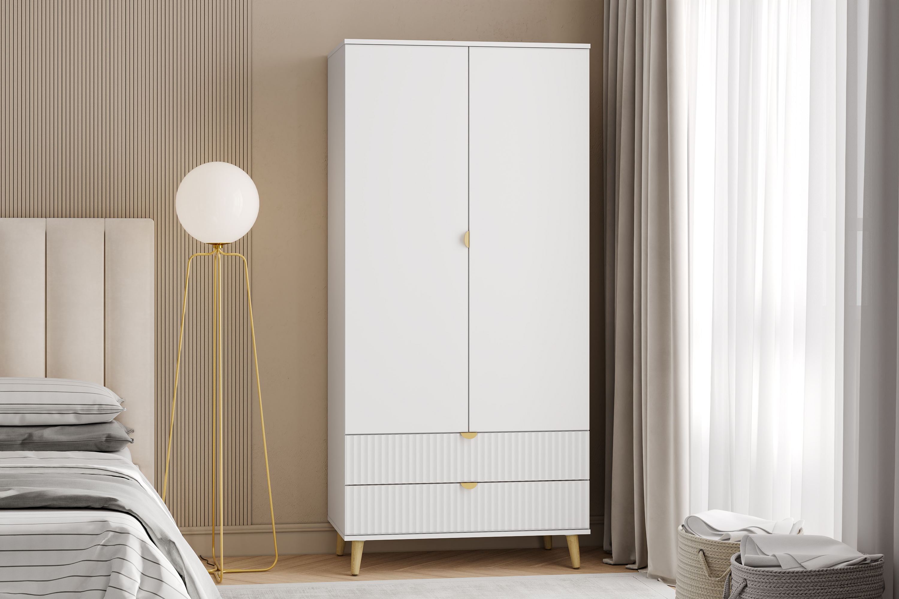 Модульная композиция включает комод и тумбу ТВА, оснащенные выдвижными ящиками, которые открываются плавно и бесшумно благодаря шариковым направляющим, а в шкафу удобно организовать книги, предметы декора или посуду, при этом высокие опоры облегчают процесс уборки.
