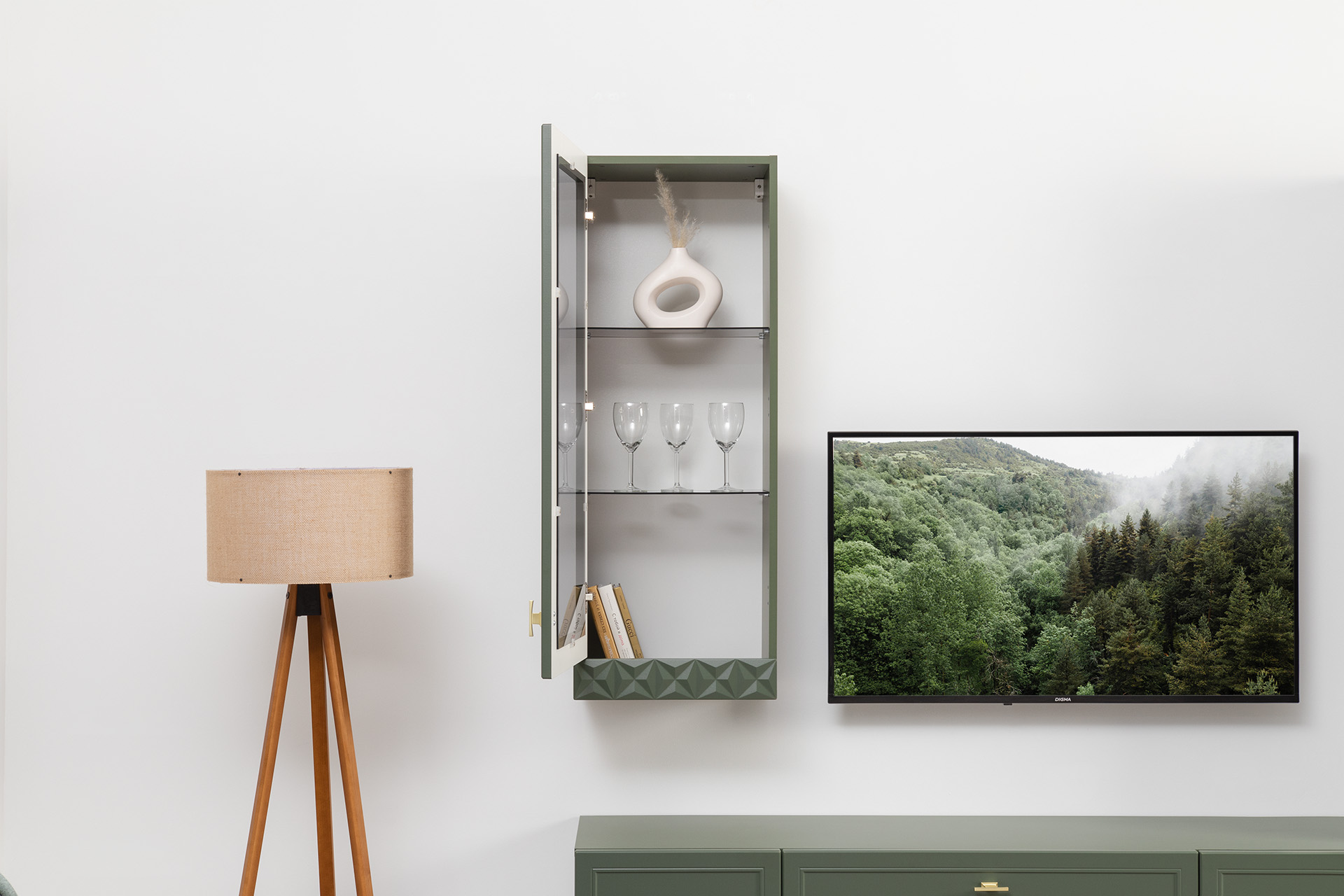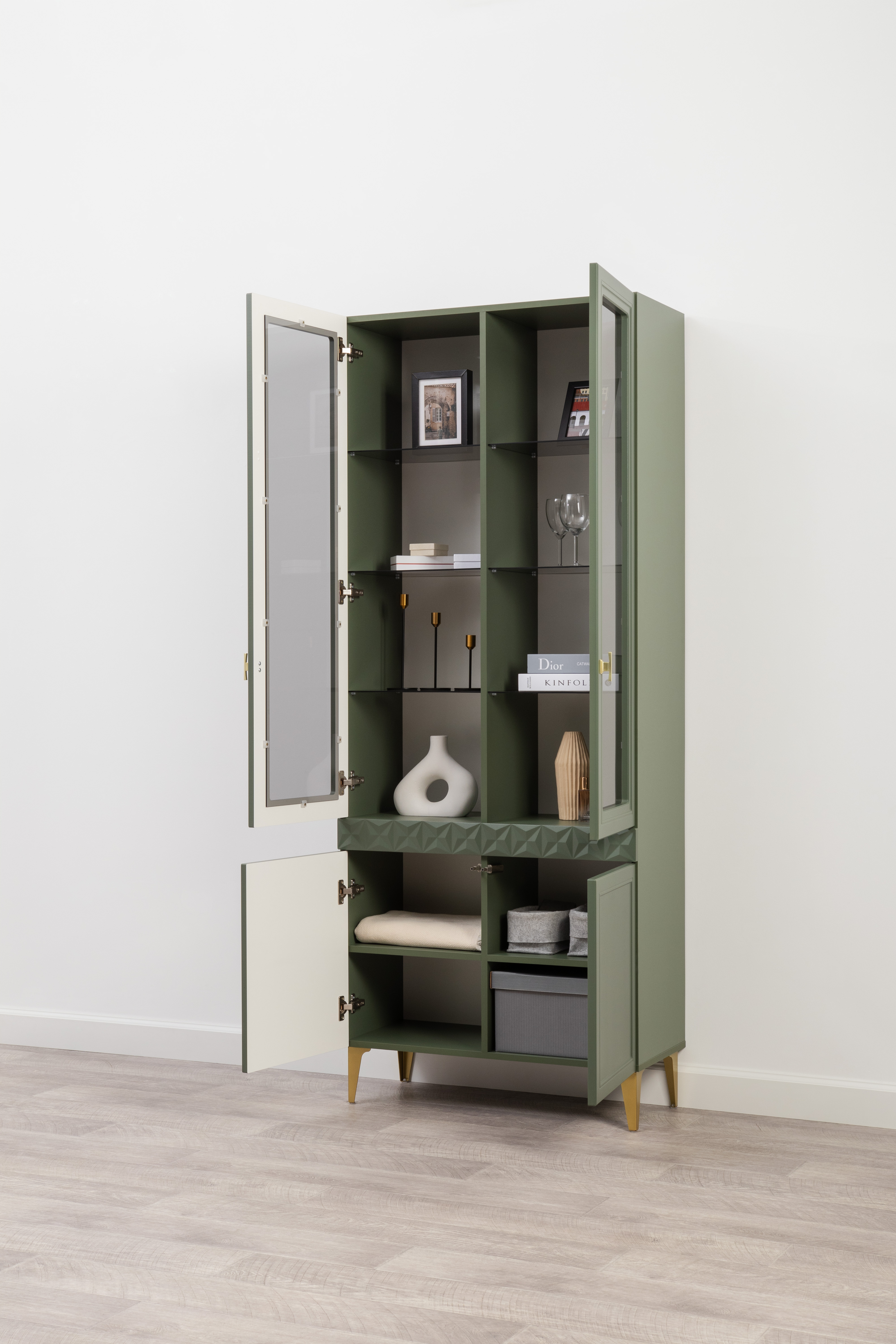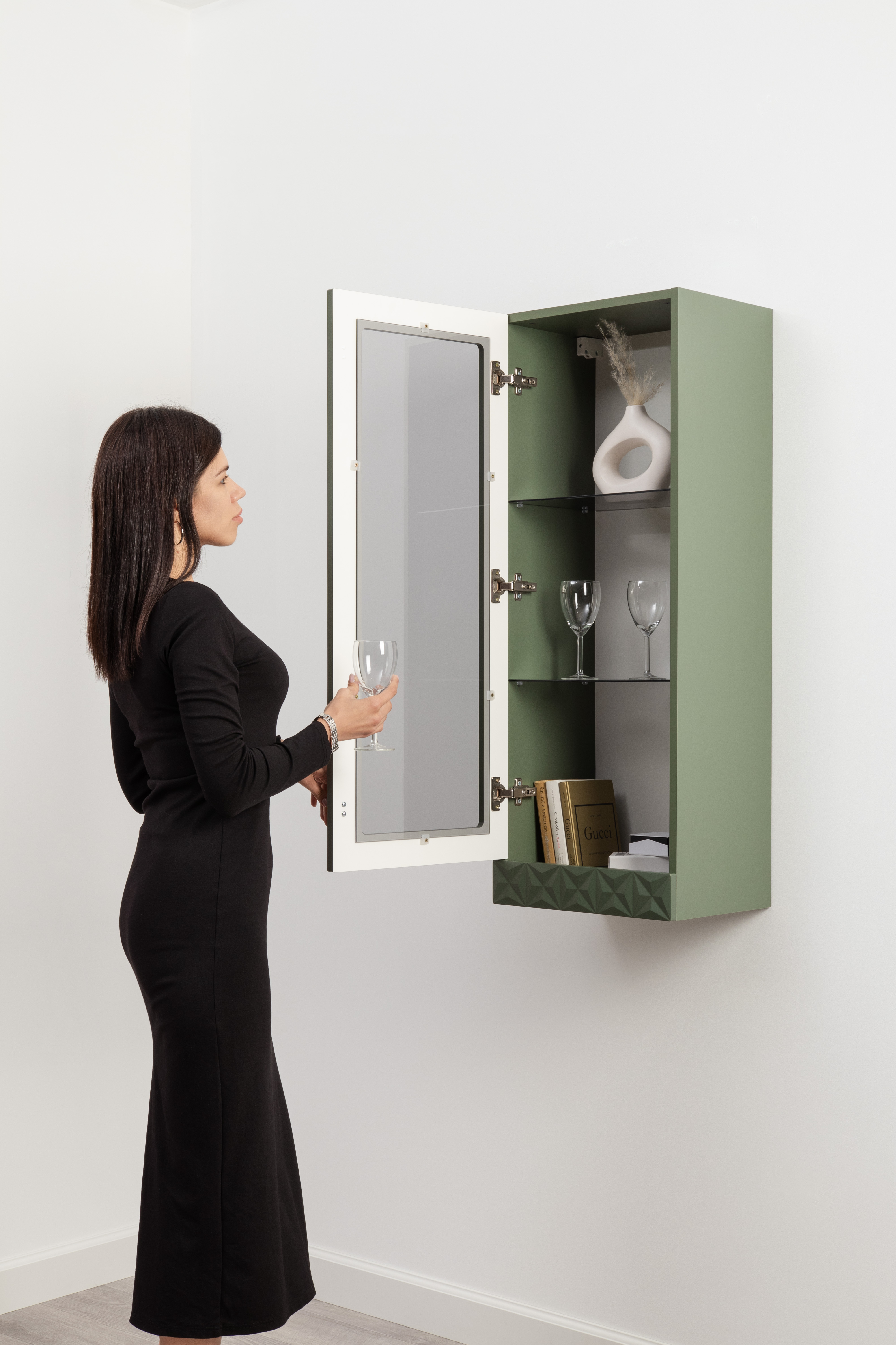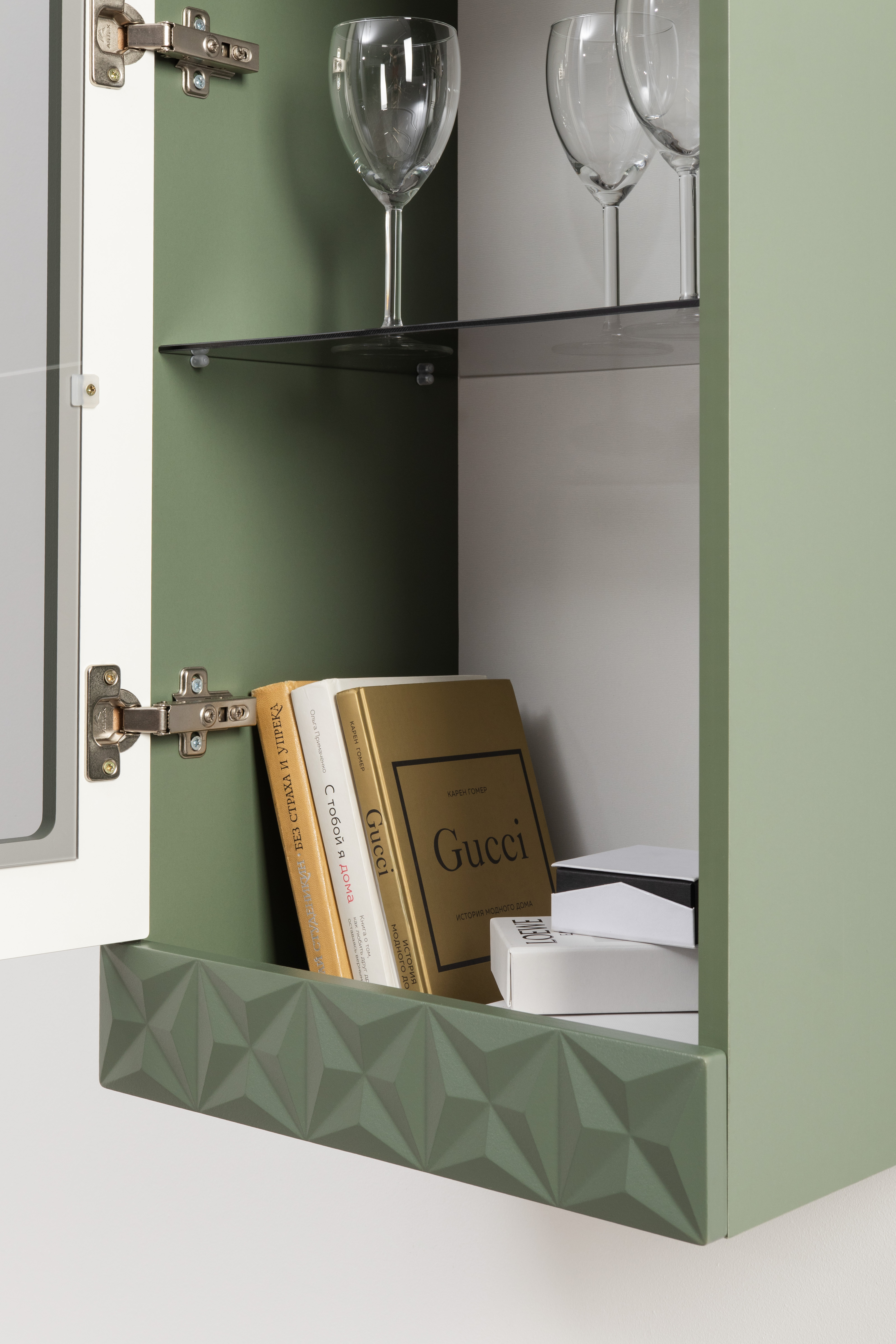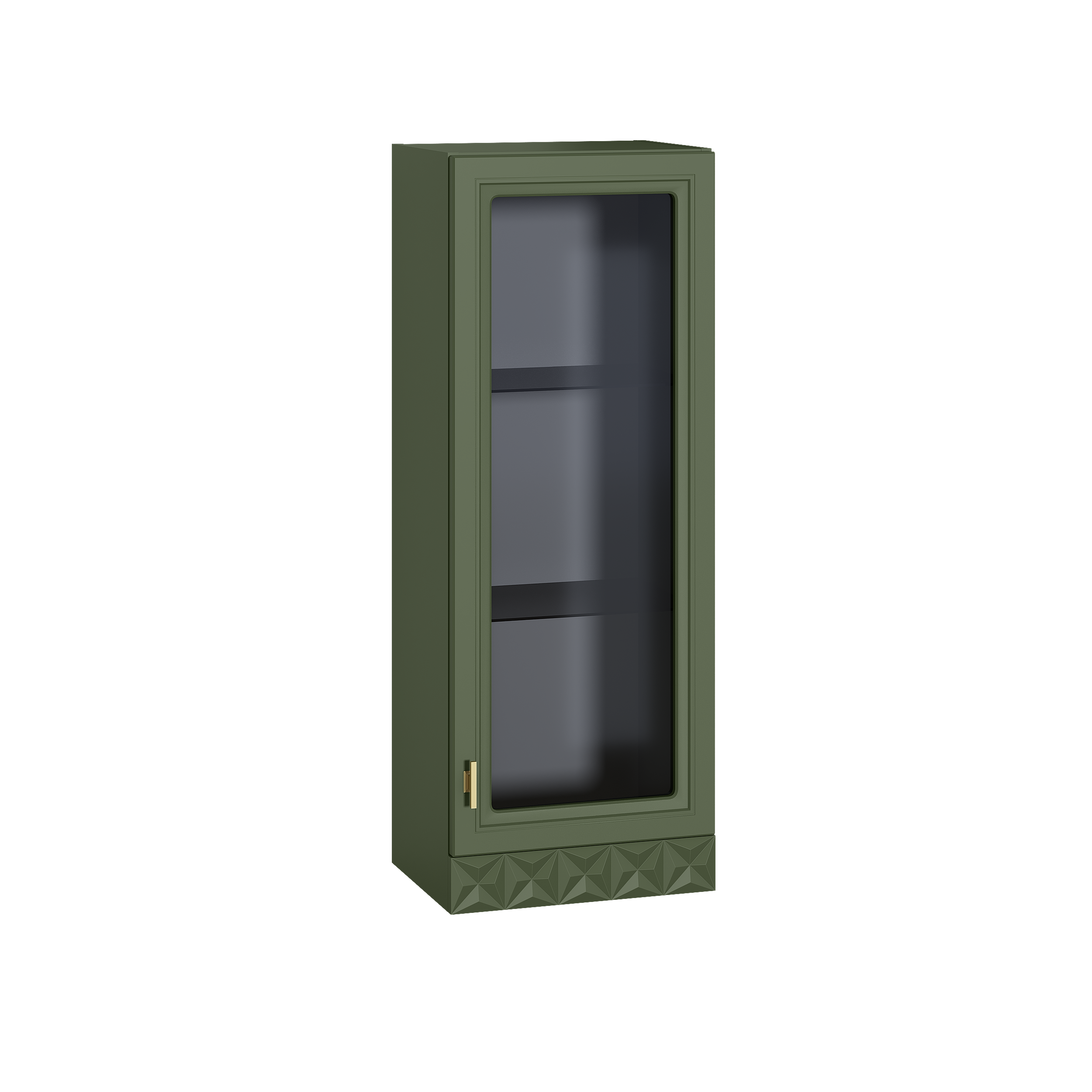 Шкаф-витрина Марион 16.397.01 дымчатый зеленый K521, олива шагрень AG 1050 ПВХ (собирается на любую сторону)
