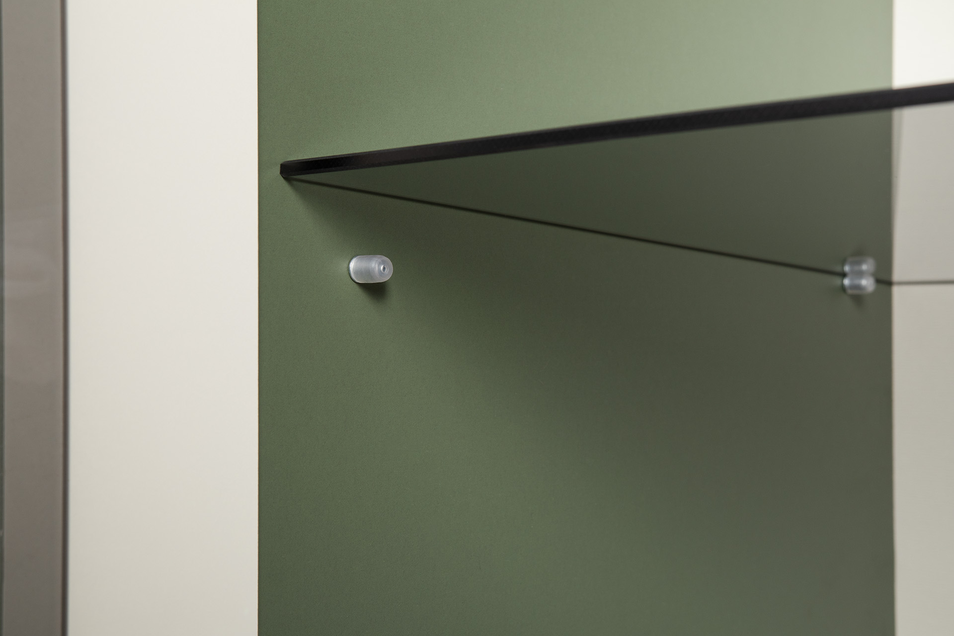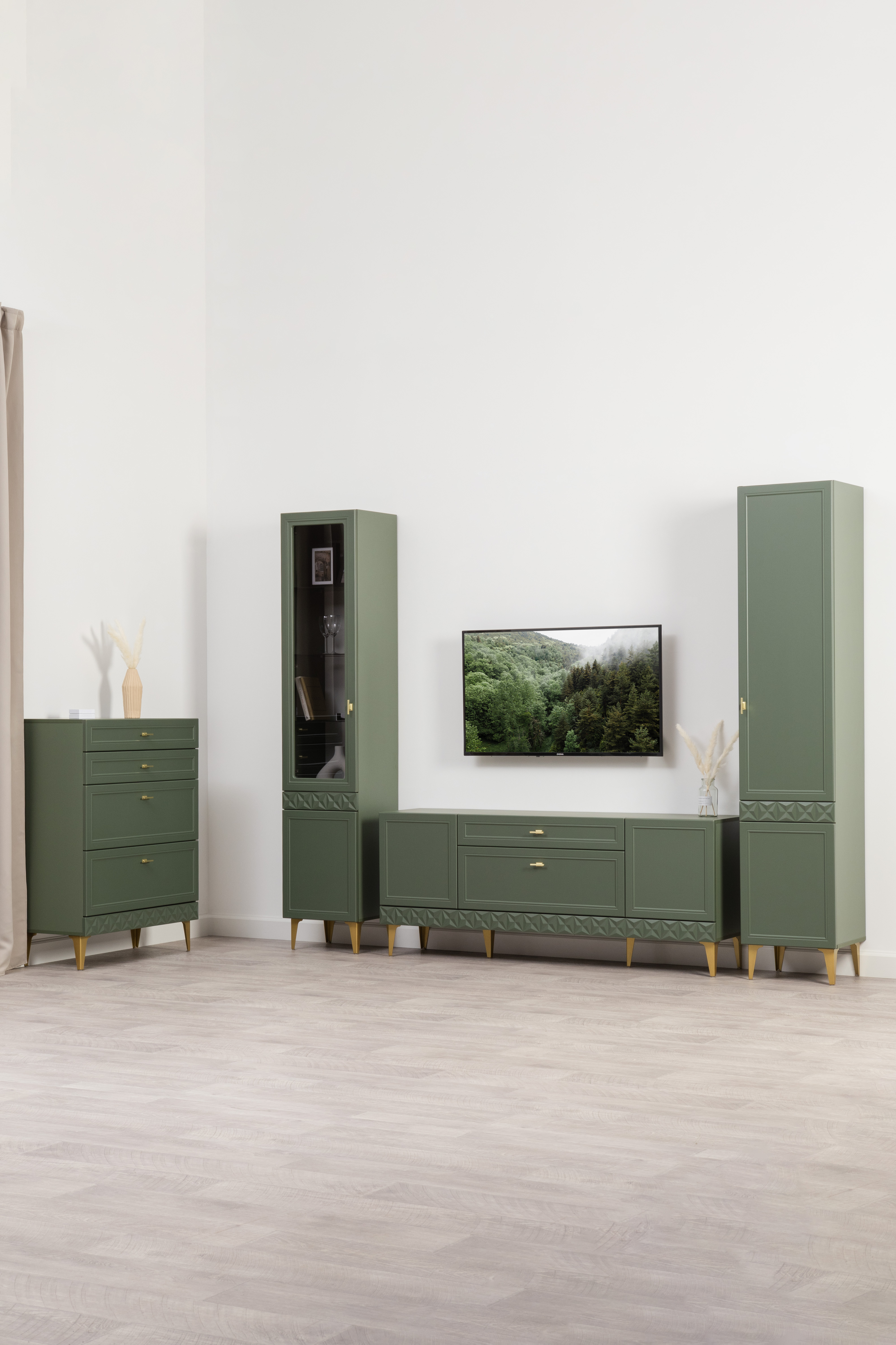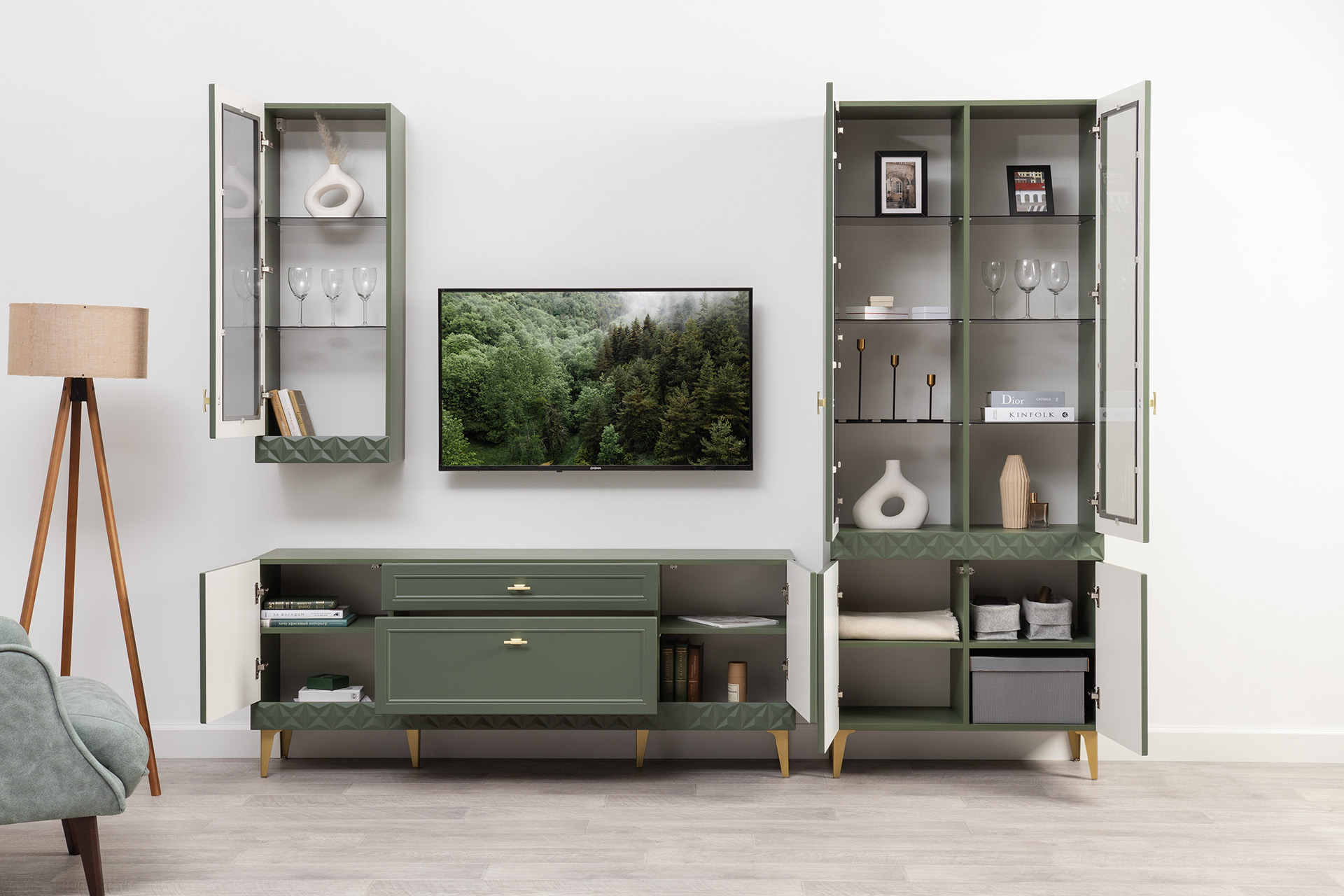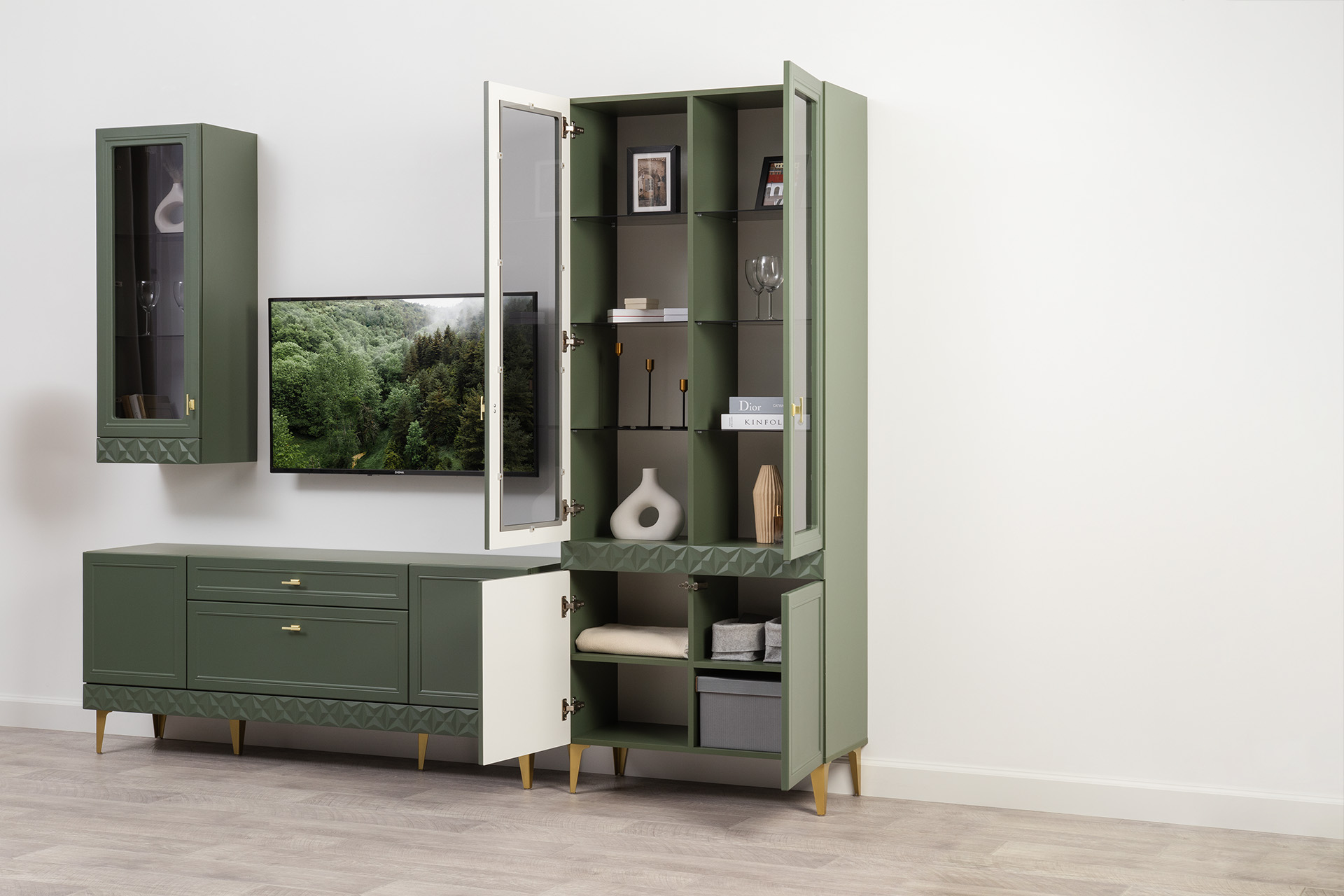 Гостиная Марион композиция 2 дымчатый зеленый K521, олива шагрень AG 1050 ПВХ, белый PE шагрень (собирается на любую сторону)