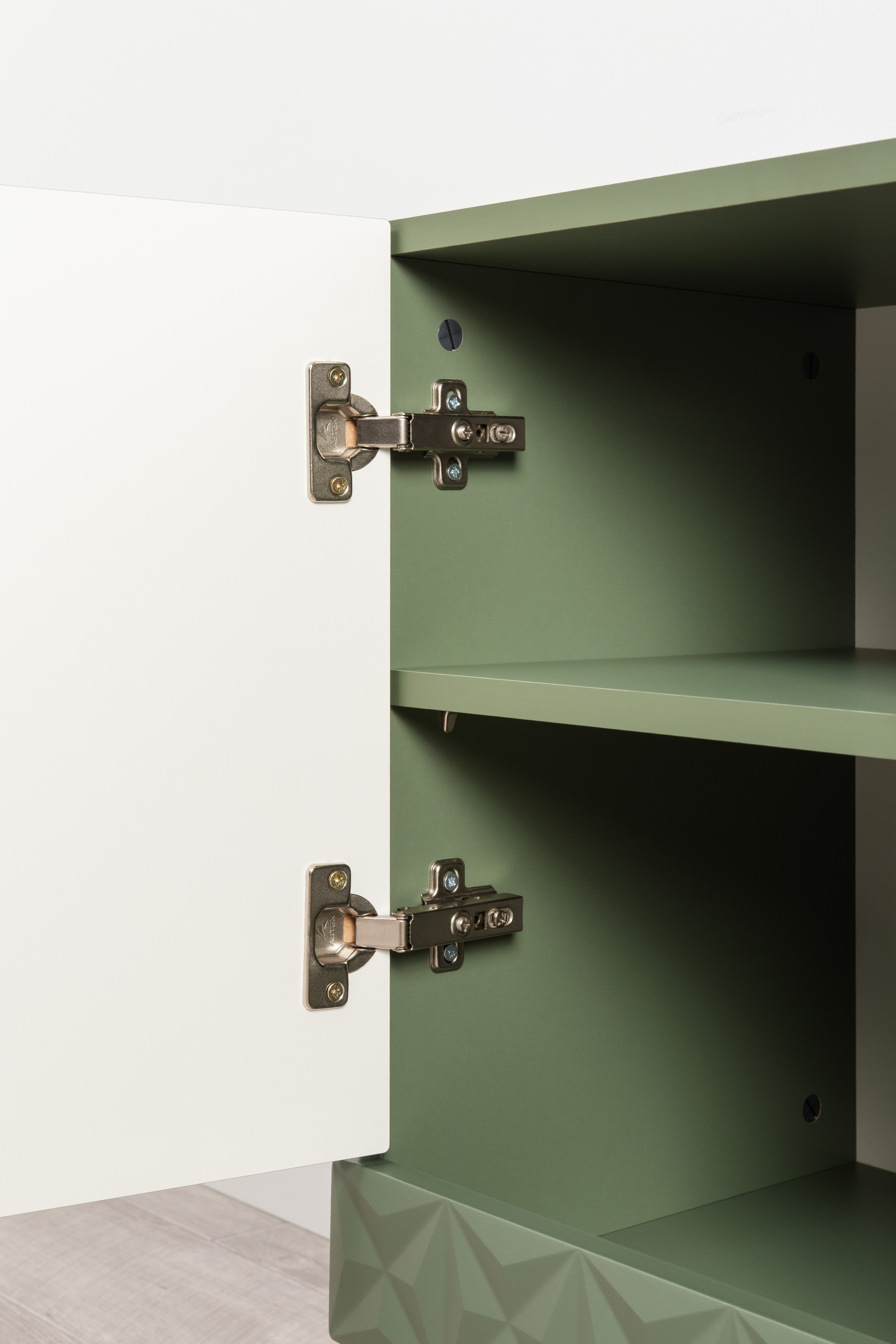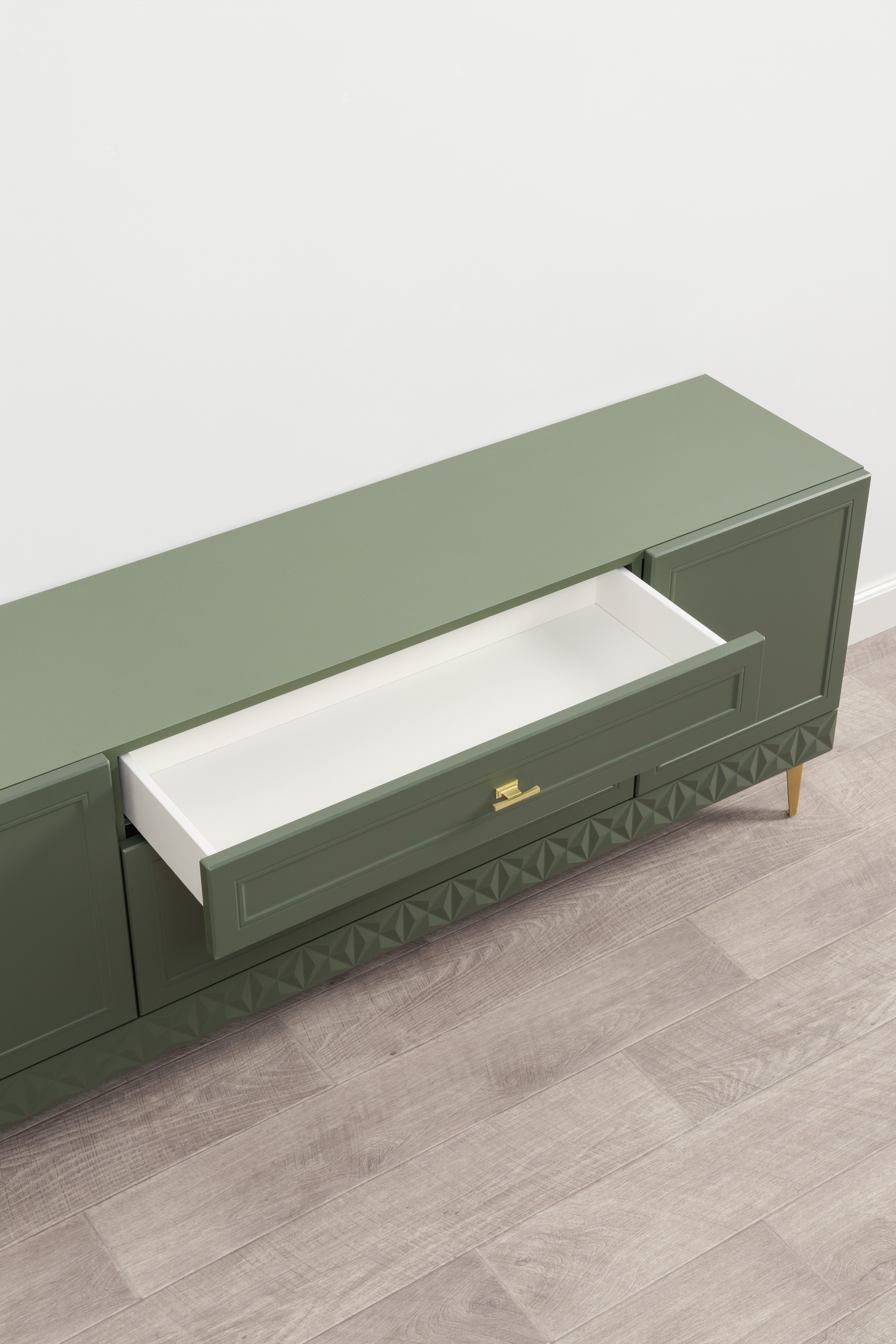 Комод Марион 16.249 дымчатый зеленый K521, олива шагрень AG 1050 ПВХ, белый PE шагрень