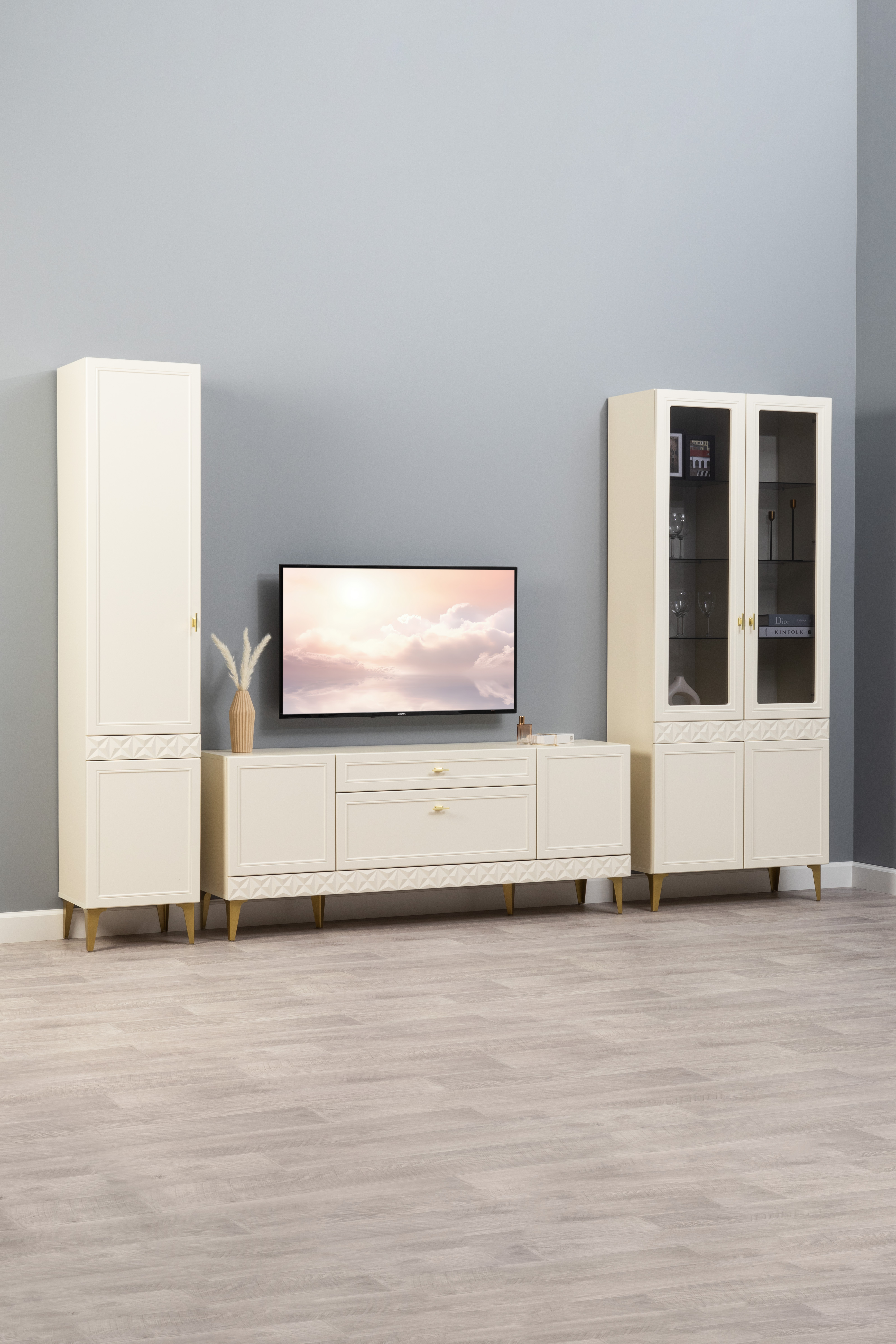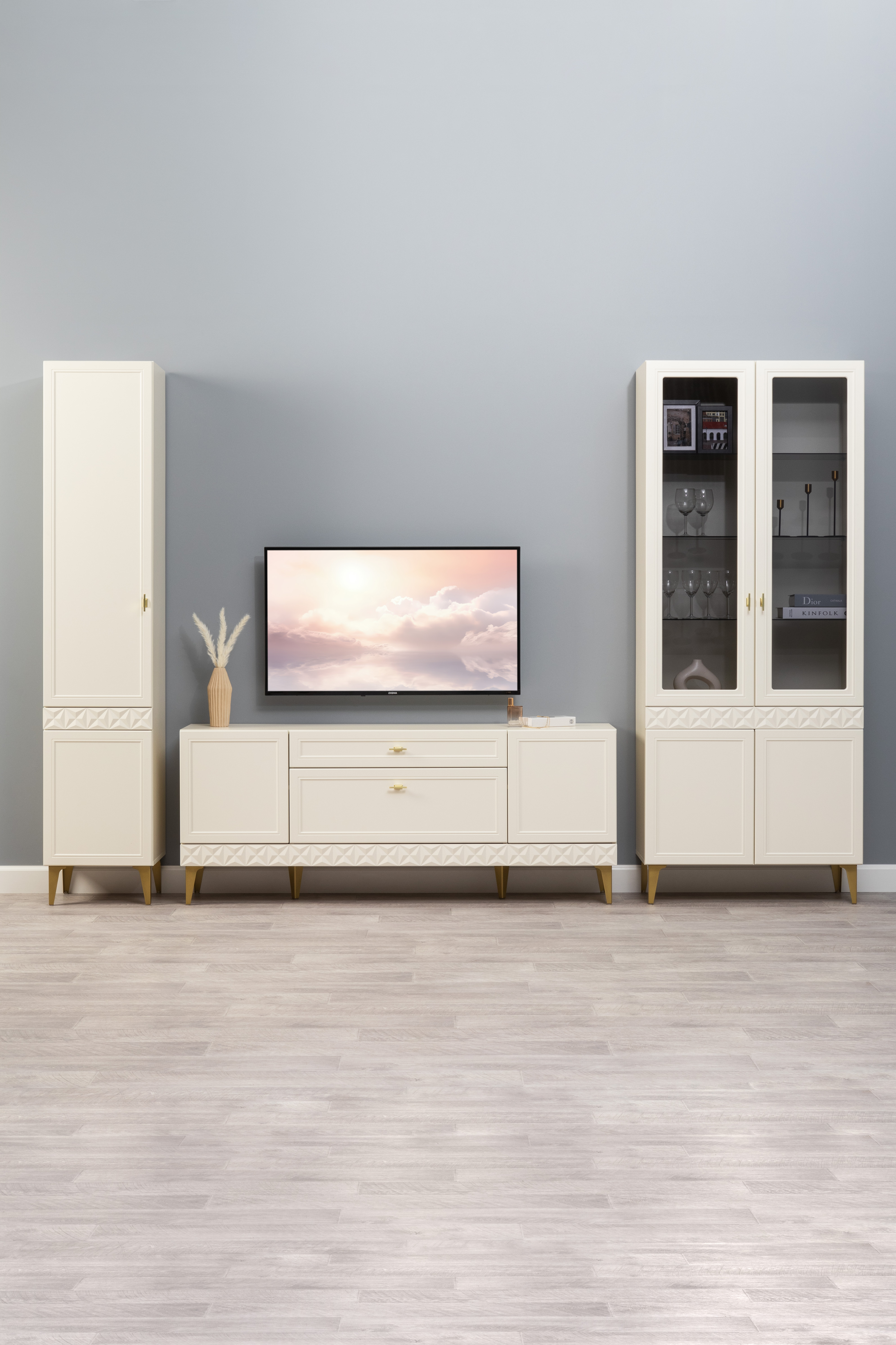 Гостиная Марион композиция 3 слоновая кость С341 PE, слоновая кость 6898 ПВХ, белый PE шагрень (собирается на любую сторону)