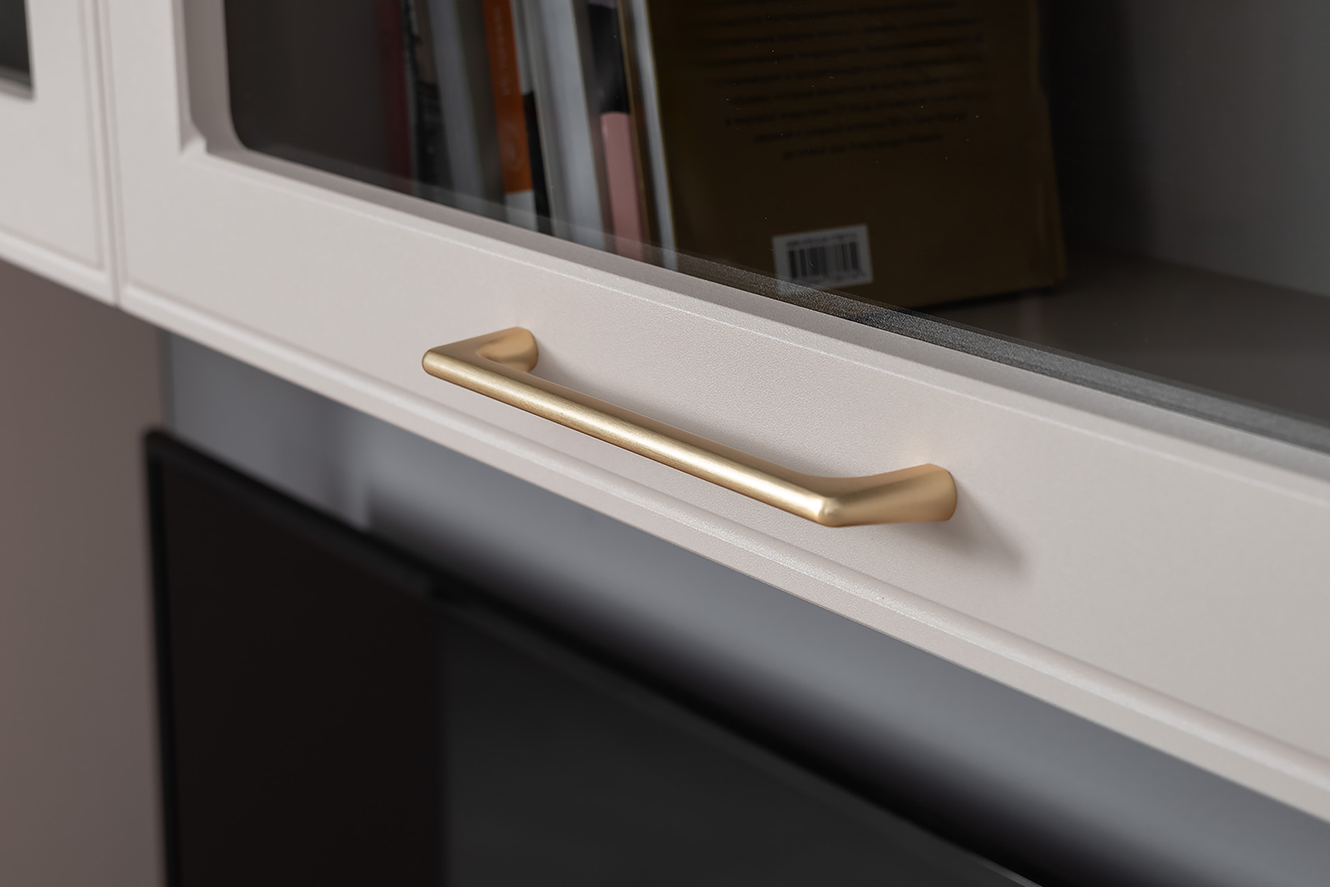 Фрезерованные фасады из МДФ, металлические ручки и витрины с тонированным стеклом создают изысканный образ.