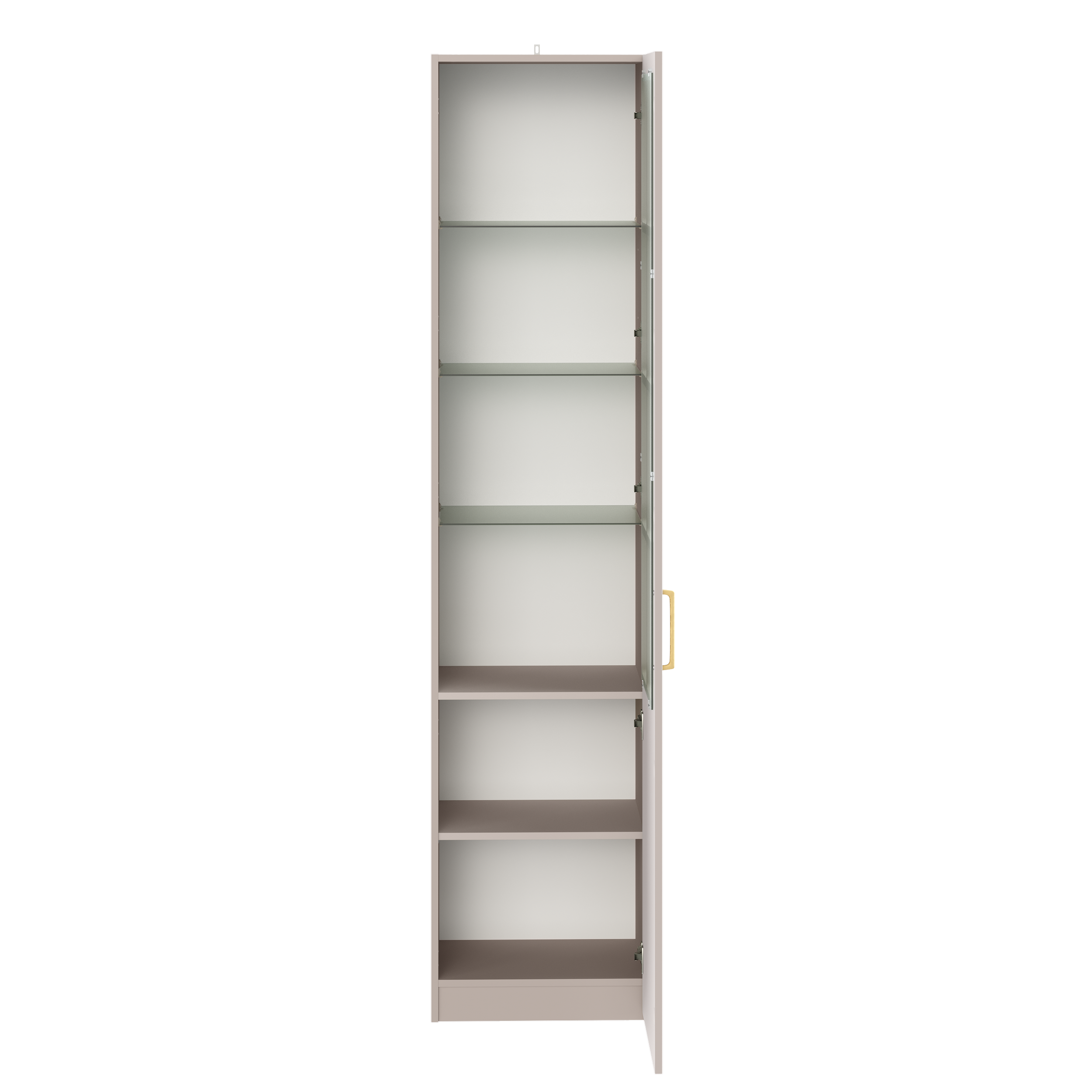 Фрезерованные фасады из МДФ, металлические ручки и витрины с тонированным стеклом создают изысканный образ.