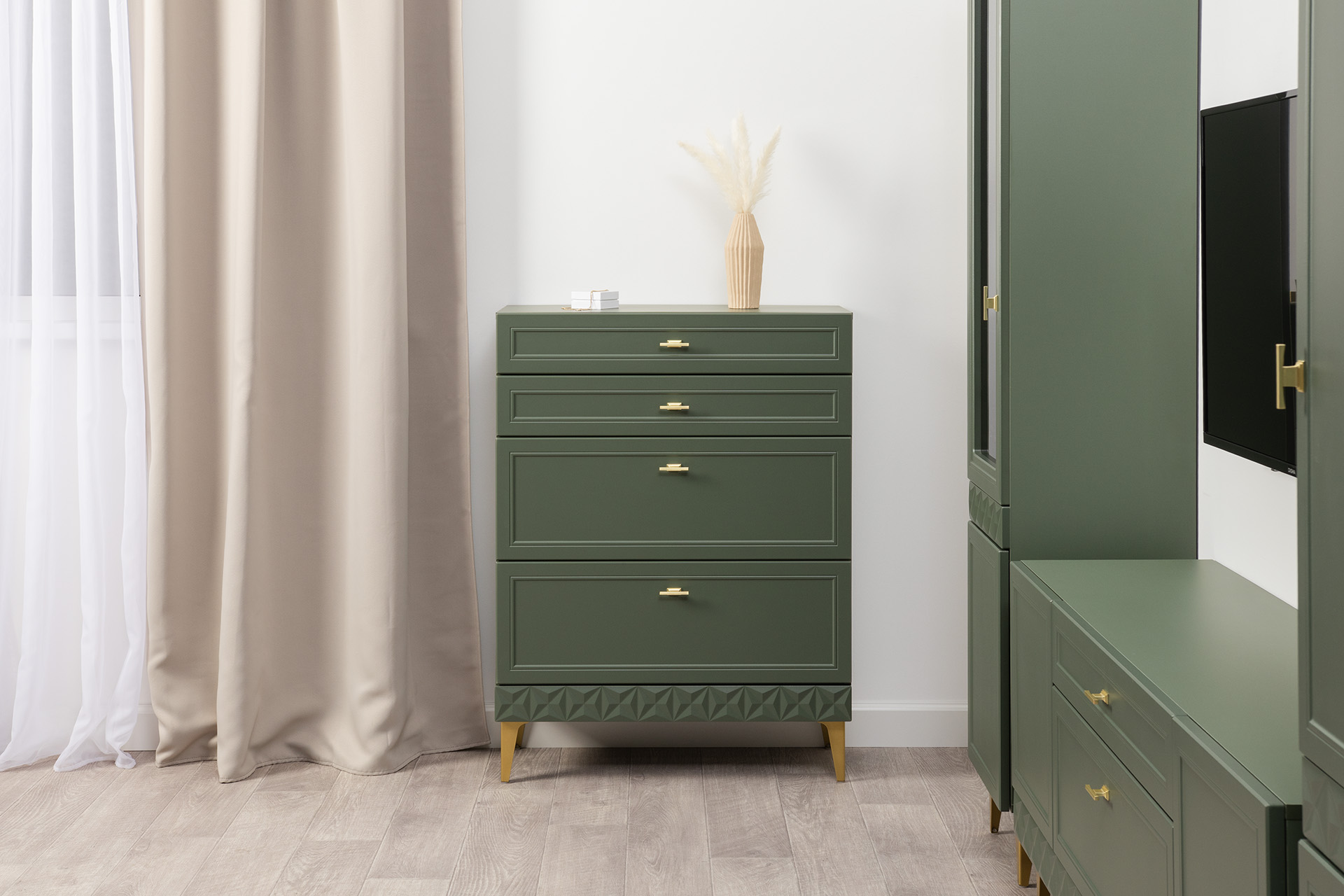 Изящные линии, глубокая фрезеровка фасадов из МДФ и благородные оттенки. Утончённая «Слоновая кость» и изысканная «Олива Шагрень» с глубоким зелёным тоном — создают атмосферу уюта, тепла и благородства. Металлические ручки и опоры золотого цвета придают мебели утончённый блеск, а петли и направляющие с доводчиками обеспечивают плавное и бесшумное закрытие фасадов.
