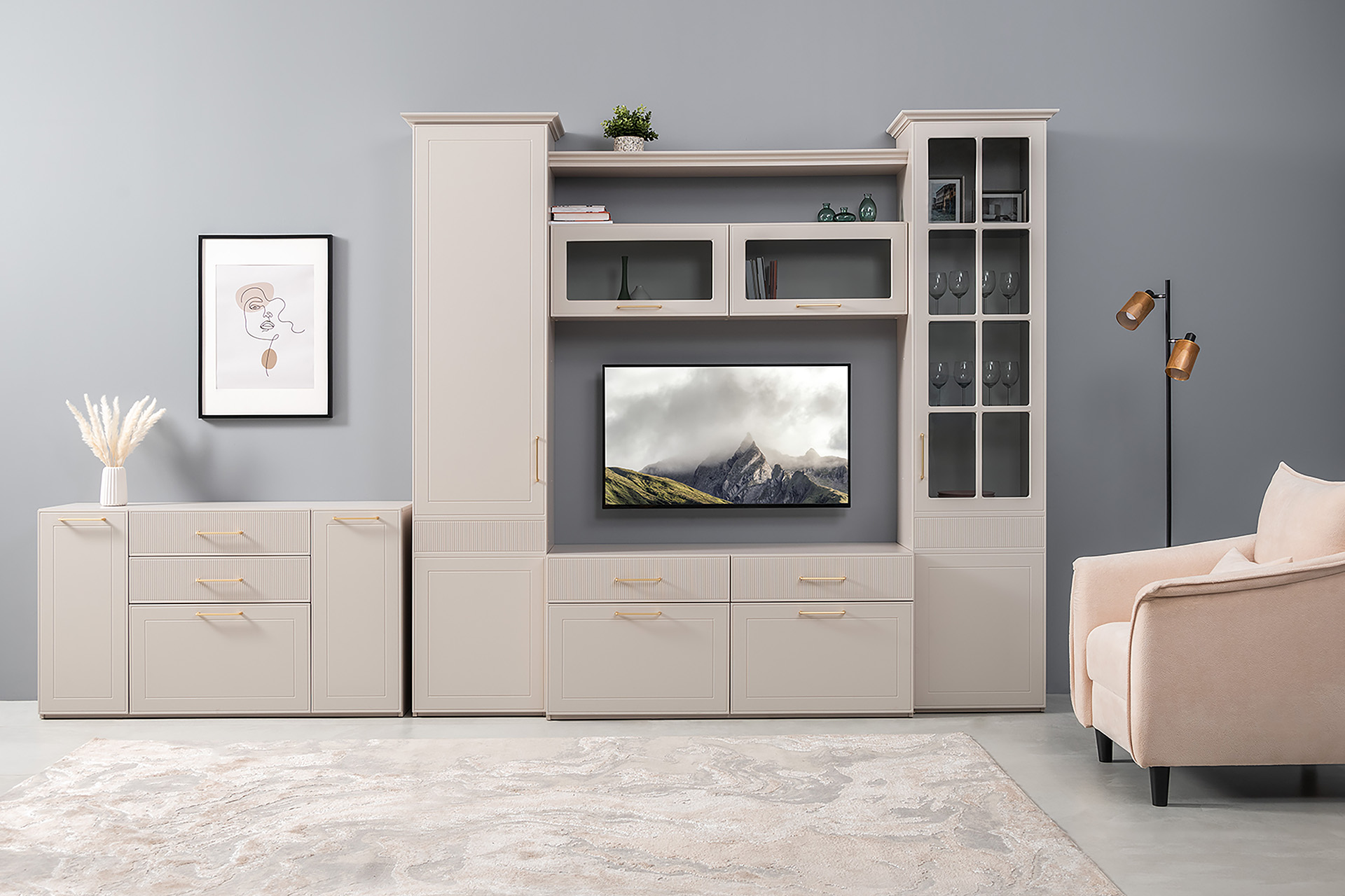 Тумба под ТВ Ричфорд 16.61 кашемир 5981 BS, моно керамика D166-2 ПВХ, белый PE шагрень